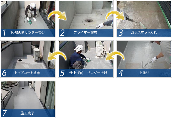 ウレタンゴム系・ゴムアスファルト系・FRP系・等の材料により防水層を作りあげる工法です。